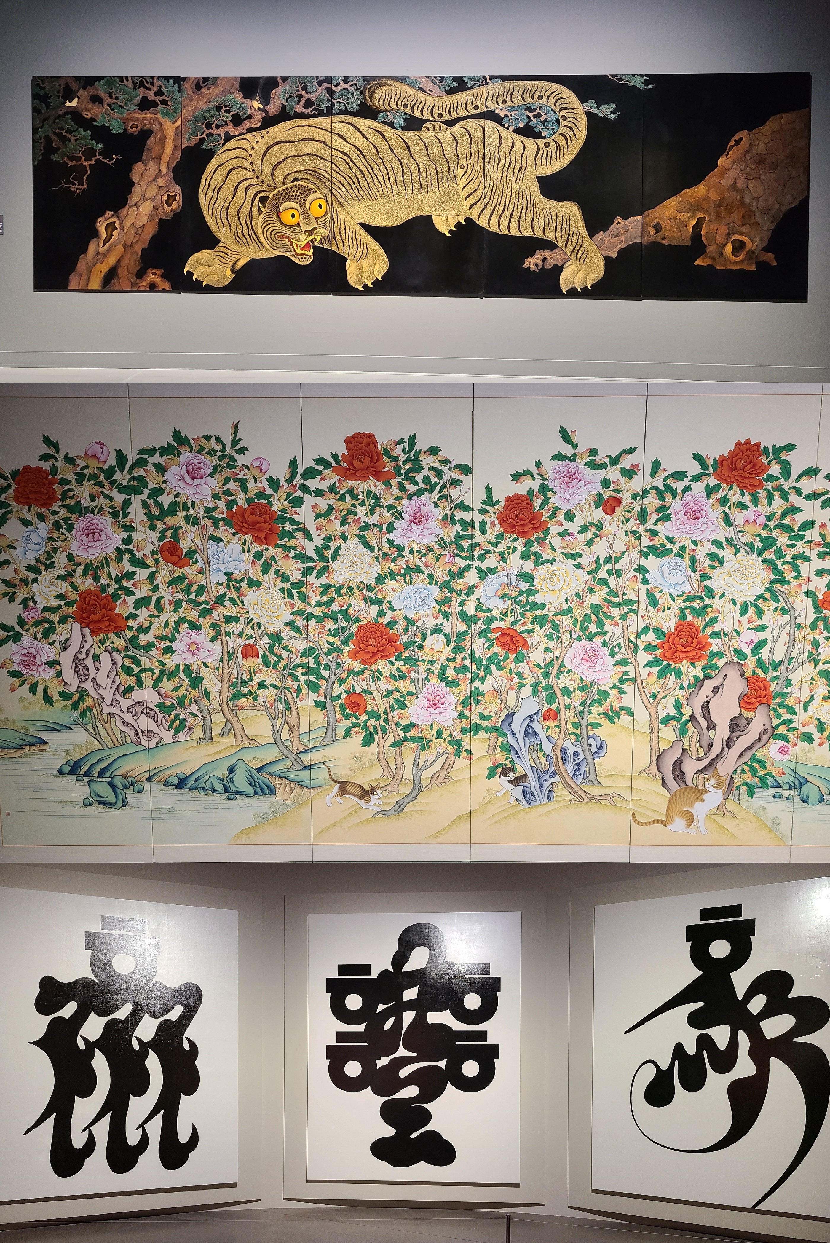 전시실의 넓은 공간으로 들어가자마자 우리를 기다리는 것은 한 쪽 벽면을 아주 크게 차지하고 있는 거대한 호랑이 그림이었다. 대표적인 민화의 소재였던 호랑이를 그린 대호도를 재해석 하여 옻칠로 제작된 작품 속에서 검은 바탕에 금 빛 털을 가진 호랑이가 형형하게 눈을 밝히고 있었다. 호랑이 주위를 둘러싼 소나무의 이파리 하나하나도 너무나 세밀하게 묘사되어 소나무 숲에서 호랑이를 맞닥뜨린 것 같은 느낌을 받았다.